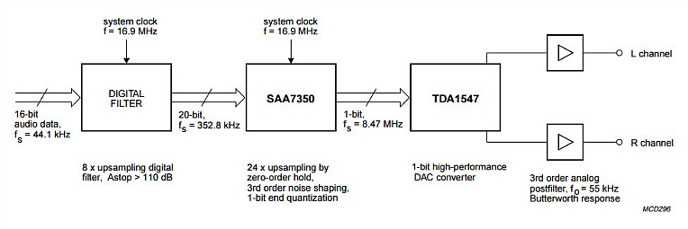 (내용추가) SAA7350GP 매뉴얼, TDA1547 매뉴얼에서는 정말로 고급기를 만들고자 함이라면 두 개를 조합(SAA7350은 디지털-필터로서, TDA1457은 DAC로서)해서 쓰라고 명시되어 있다. 그런데 인켈은 그렇게 하지않았다.
