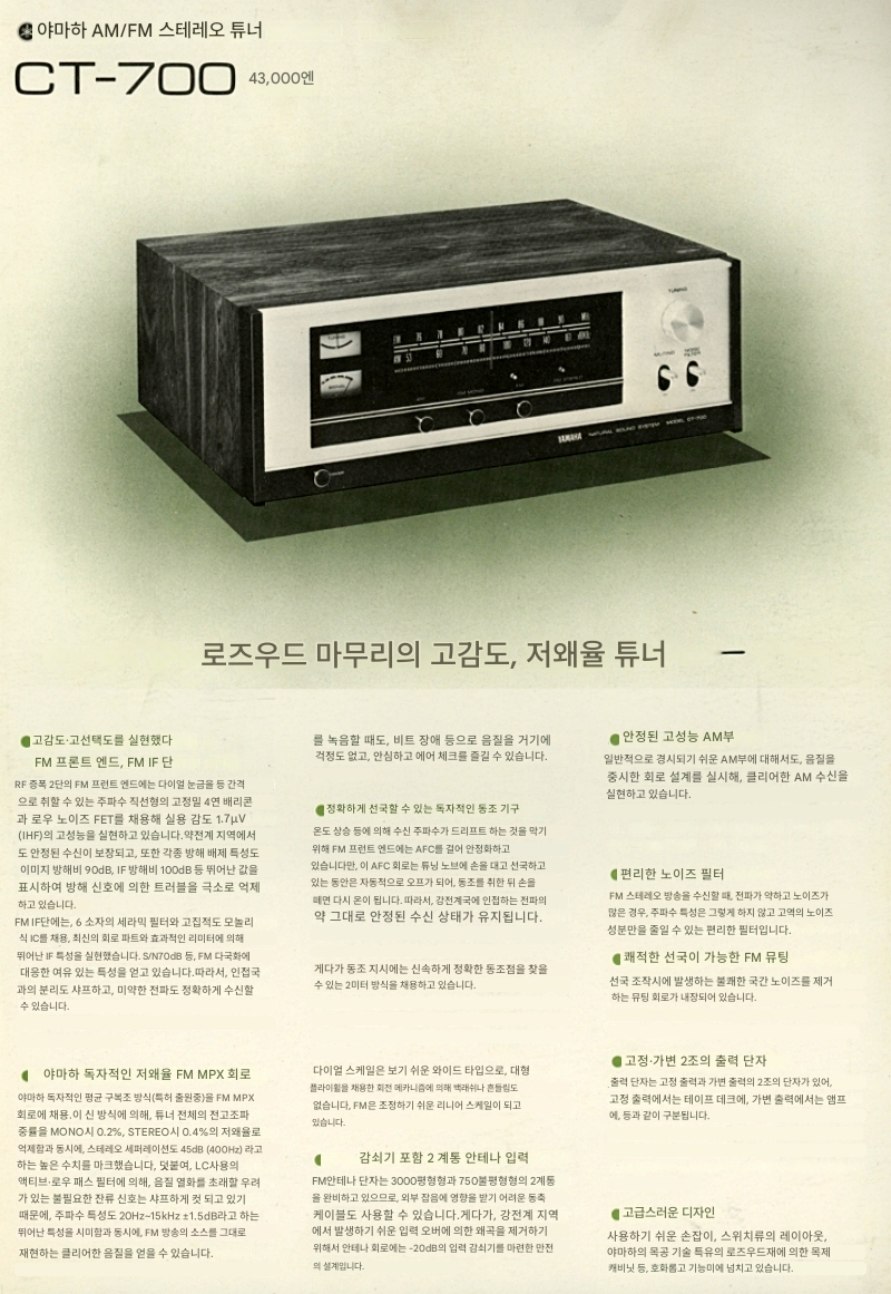 아래 야마하 팸플릿의 설명에서, “MPX 회로는 야마하의 독자적인 트랜지스터 스위칭을 이용한 ‘평균 복조 방식’을 채택하여 왜곡과 분리도를 향상시킵니다.”가 눈에 들어온다.