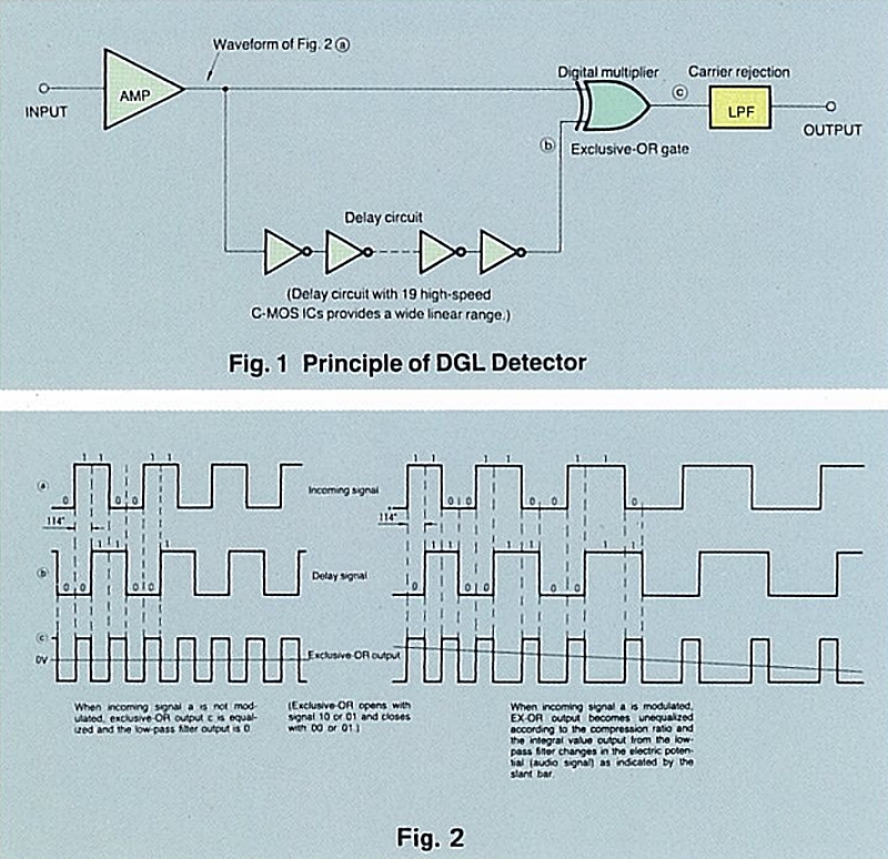 T-106은 새롭게 개발된 DGL(차동 이득 선형, Differential Gain Linear) 검출기와 평탄한 군지연(Group Delay) 특성을 갖는 특별히 선택된 중간 주파수 필터의 조합을 통해 최소 왜곡과 우수한 캡처 비율(Capture Ratio)로 안정적인 특성을 구현합니다. DGL 검출기는 그림 1과 같이 직렬로 연결된 19개의 고속 CMOS IC를 통합합니다. 위상각은 왜곡을 최소화하고 최상의 신호대잡음비를 얻기 위해 114° 지연됩니다. 지연 신호와 입력 신호는 배타적 OR 회로에 인가됩니다.