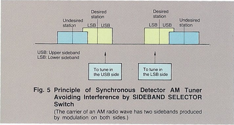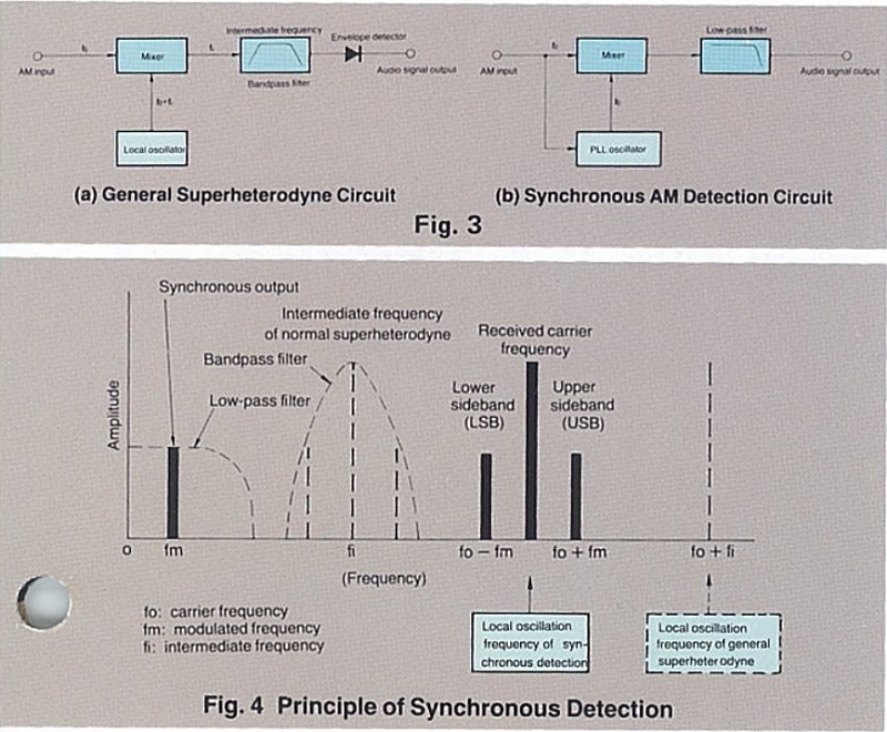 그림 3(a)는 일반적으로 사용되는 슈퍼헤테로다인 수신기의 시스템 다이어그램을 보여줍니다. 그림 3(b)는 동기 검출기의 다이어그램을 보여줍니다. 동기 검출기는 그림 4와 같이 입력 반송파에 매칭된 국부 발진 주파수를 믹서에 입력하여 오디오 신호를 집합적으로 검출합니다. 선택도는 오디오 회로에 제공된 저역 통과 필터의 특성에 따라 결정됩니다. 동기 검출기는 왜곡을 최소화하며 AM 스테레오 방송이 대중화되면 표준 부품이 될 것으로 예상됩니다. 동기 검출기의 또 다른 뛰어난 특징은 그림 5와 같이 원하지 않는 방송국의 주파수가 원하는 방송국의 주파수보다 높거나 낮은지에 따라 측파대를 선택할 수 있다는 것입니다. 야간에는 공중파가 강하기 때문에 동기 검출기는 특히 방송국 간섭이 문제가 될 때 유용합니다.