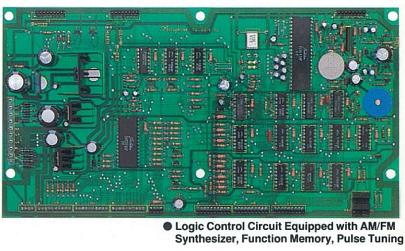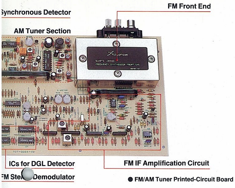 프런트엔드는 사실상 모든 튜너의 “심장”입니다. 입력 신호를 선택하고 증폭하여 10.7MHz의 중간 주파수 신호를 생성하여 검출기로 전달합니다. 이 부분의 설계는 감도, 간섭 제거 성능, 그리고 튜너의 품질을 결정합니다. T-106의 프런트엔드는 매우 중요한 RF 혼변조(Inter-modulation) 억제를 크게 개선했습니다. 이는 PLL 회로와 함께 작동하는 버랙터 다이오드를 활용한 진정한 전자 제어 시스템과 두 단계의 이중 동조 RF 회로 및 동조된 버퍼 증폭기를 사용하여 달성되었습니다.