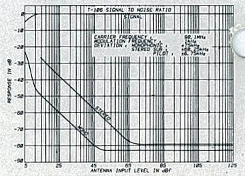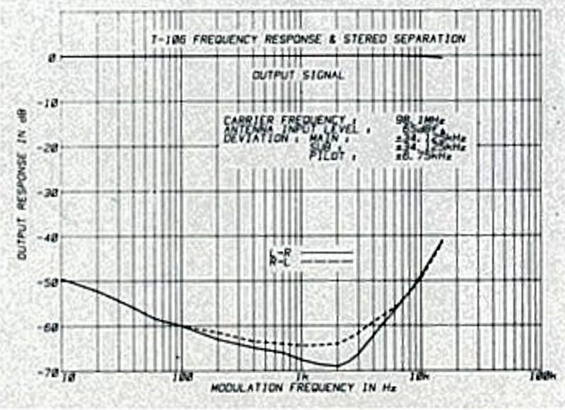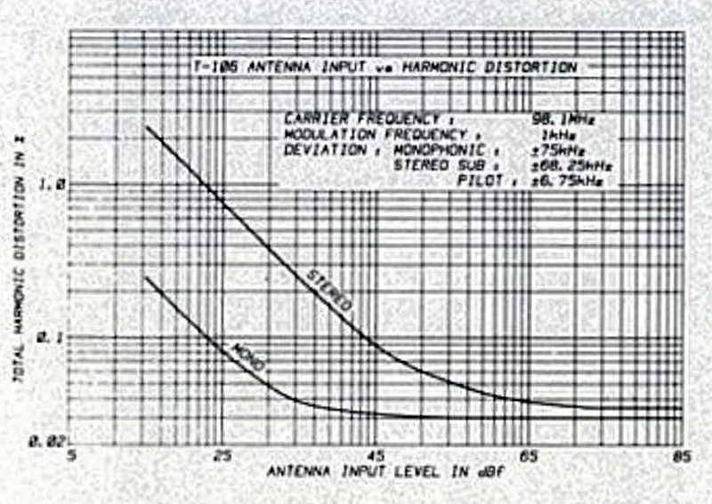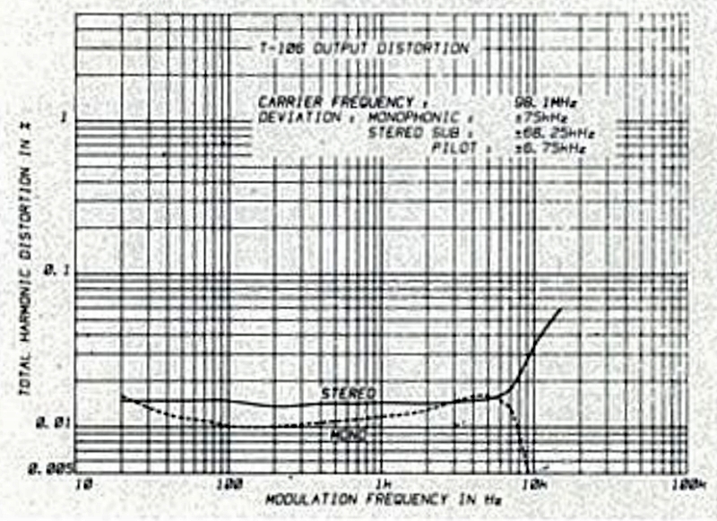 RF 98.1Mhz, 1Khz 신호, 서브 캐리어 68.25Khz + Pilot 6.75Khz = 75Khz 조건에서, a) 6Khz 부근에서 THD 급증, b) 1Khz에서 0.015%쯤 → 요약 표기는, ‘TOTAL HARMONIC DISTORTION with SELECTIVITY switch set to NORMA 80 dBf input at ±75 kHz deviation : 20Hz 0.04%, 1000Hz 0.04%, 10000Hz 0.04%’ → 65dBf 입력일 것 같기는 하지만… 안테나 입력 강도를 적어 놓지 않았음. 그래프와 0.04%의 상관관계를 파악할 수 없음.
