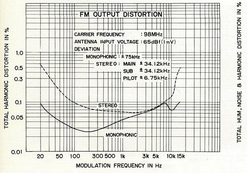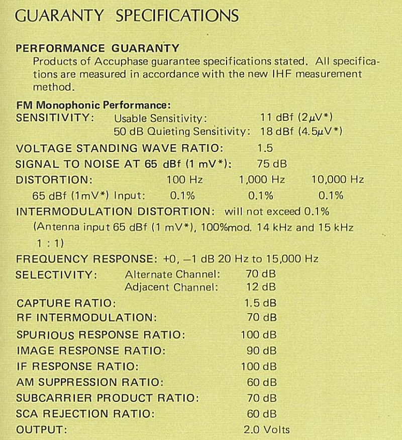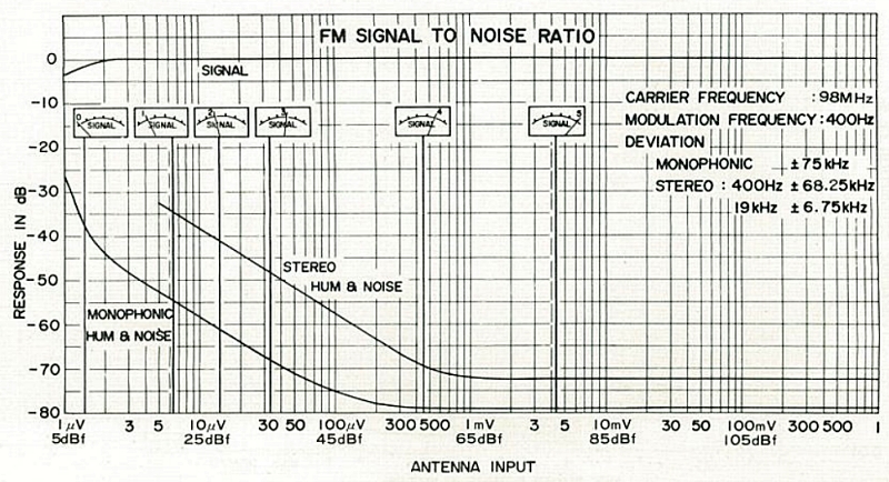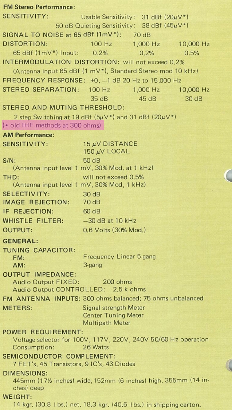 이상에서, 300오움 안테나 단자에 전력단위 65dBf RF 신호가 주입되는 조건임을 명시하고 있다. (IHF는, 지금은 사라진 미국 하이파이협회(Institute of High Fidelity)의 축약어. 미국이 그렇고 유럽은 DIN 지침에 따름.)