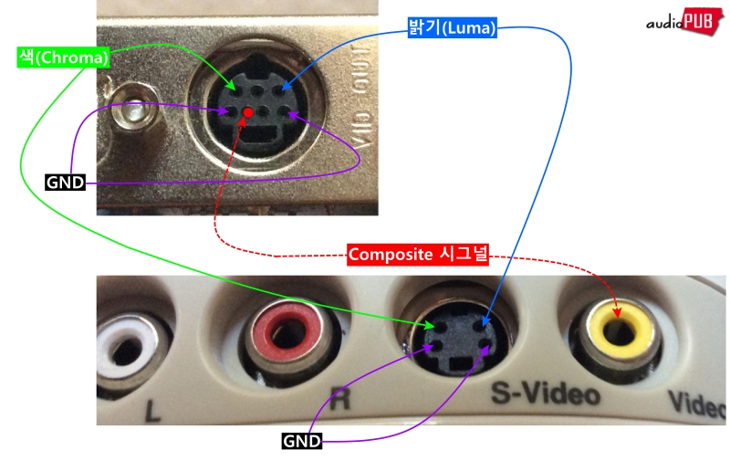 색차 신호와 밝기 신호 핀 할당은 위치까지 동일하고, 7핀 쪽에 컴포지트 신호 교환용 핀이 따로 지정되어 있음. 표준 할당 핀 정의 그대로 연결하면, 다음과 같은 모습이 될 것이다. 원론상.