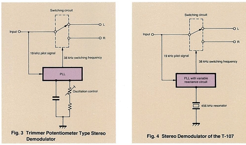 FM 스테레오 복조기의 거의 완벽한 성능 특성을 구현하기 위해, 튜너의 내부 발진 회로는 입력 신호에 포함된 동기화 파일럿 신호를 사용하여 PLL 회로에 의해 동기됩니다(그림 3 참조). 이를 통해 정확한 38kHz 스위칭 신호를 얻을 수 있습니다. T-107은 내부 발진 회로에 세라믹 공진기와 제어 전압에 의해 제어되는 가변 리액턴스 회로의 새로운 조합을 채택했습니다(그림 4 참조). 이는 기존 범위보다 좁은 고정 주파수 범위에서 정확한 스위칭 신호를 얻을 수 있음을 의미합니다.