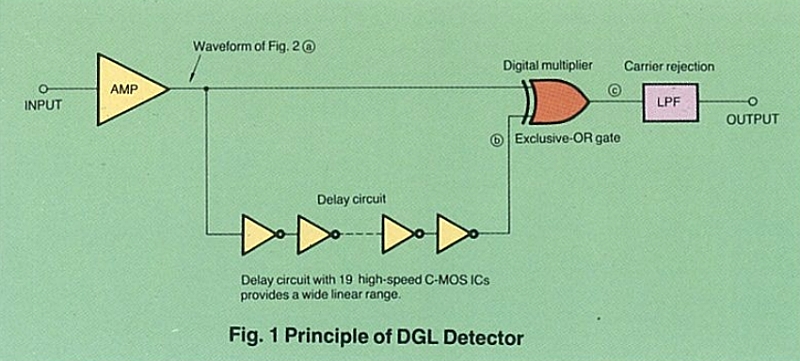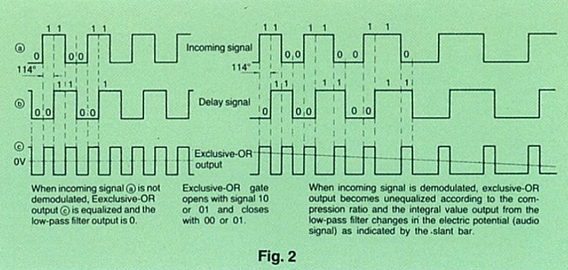 T-107은 새롭게 개발된 DGL(차동 이득 선형) 검출기와 특별히 선택된 중간 주파수 필터(평탄한 군 지연 시간 특성)를 결합하여 최소 왜곡과 우수한 포착률로 안정적인 튜닝 특성을 구현합니다. DGL 검출기는 그림 1과 같이 직렬로 연결된 19개의 고속 C-MOS IC를 통합합니다. 위상각은 왜곡을 최소화하고 최상의 신호대 잡음비를 얻기 위해 114° 지연됩니다. 결과적인 지연 신호와 입력 신호는 배타적 OR 회로에 인가됩니다. 그런 다음 게이트 회로는 두 신호 사이의 전위에 따라 닫히거나(11, 00) 열립니다(10, 01). 변조에 의해 생성된 신호의 압축률은 디지털 방식으로 검출(즉, 논리 곱셈)되어 음성 신호를 얻습니다(그림 2). 지연 회로의 선형 범위가 매우 넓고(±5MHz) 회로 조정이 필요 없기 때문에 안정적이고 고품질의 선형 차동 이득 특성을 얻을 수 있습니다.