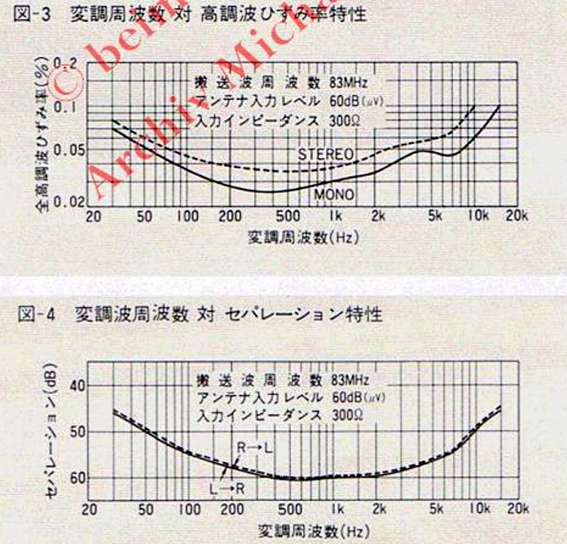 FM 5련, 실용 감도 0.9µV(10.3dBf), 50dB Q.S. 스테레오 18μV (36.4dBf) 이미지 방해비 120dB (83MHz) 스퓨리어스 응답 120dB, IF 간섭비 110dB, AM 억제비 = 70dB, 선택도 (± 400kHz) WIDE = 50dB, NORROW = 90dB, 캡처비 WIDE = 1.0dB, NARROW = 1.5dB 서브 캐리어 억제  73dB, 주파수 특성 20Hz~15kHz ± 0.5dB SN 비 스테레오 85dB THD 스테레오(90% 변조 시) 0.025% SEP. 60dB… (기타 생략)