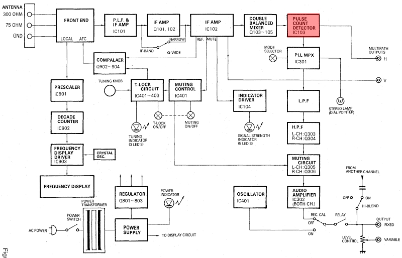 회로 흐름은, 프론트엔드 어쩌고 저쩌고 → HA11225 IF IC/단동조 직교검파 → 10.7Mhz IF → 2nd OSC와 MIXer에 의해 **Mhz로 다운 컨버전 → TR4010A와 같다고 하는 HA12041A로 PCD 검파 → HA11223W MPX IC → 포스트앰프 어쩌고 저쩌고 순이다.
