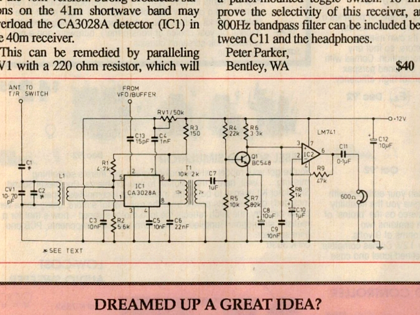 송신/수신 전환은 키드 DPDT 릴레이 또는 패널 장착 토글 스위치를 통해 처리할 수 있습니다. 이 수신기의 선택도를 높이기 위해 Cl 1과 헤드폰 사이에 800Hz 대역 통과 필터를 추가할 수 있습니다. 피터 파커, 벤틀리, 워싱턴주, $40.