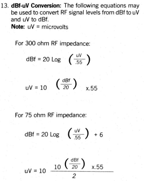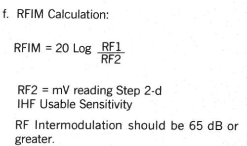 [ 절차 예시 ] a. RF 발생기 #1을 98.9MHz, 무변조(CW), 출력 10mV로 설정합니다. b. RF 발생기 #2를 98.1MHz, 무변조(CW), 출력 10mV로 설정합니다. c. 튜너를 97.3MHz로 조정합니다. d. 두 발생기의 RF 레벨을 동일하게 낮춰 튜너의 출력 신호가 3-c 단계에서 얻은 dBQ 값과 같아지도록 합니다. 이 dBQ 값에 도달하면 두 RF 발생기의 uV 출력 레벨이 같아야 합니다. e. 이 mV RF 레벨 값(RFI)을 기록합니다.