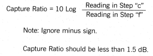 [ 절차 예시 ] 이 절차에는 RF 신호 발생기 두 대와 임피던스 정합/합산 박스가 필요합니다. a. RF 발생기 #1을 1mV, 1kHz(98.1MHz)로 변조된 모노 신호로 설정합니다. 튜너 후면의 두 레벨 조정 컨트롤을 사용하여 1kHz 오디오 출력 레벨을 0dB로 조정합니다. b. RF 발생기 #2를 무변조 신호(CW)로 98.1MHz로 설정합니다. c. 튜너 출력이 -1dB가 될 때까지 신호 발생기 #2의 RF 레벨을 높입니다. d. 신호 발생기 #2의 RF 레벨을 -1dB 출력 레벨로 기록합니다. e. 튜너 출력이 -30dB가 될 때까지 신호 발생기 #2의 RF 레벨을 높입니다. f. 신호 발생기 #2의 RF 레벨을 -30dB 출력 레벨로 기록합니다. g. 캡처 비율 계산: