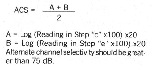 대체 채널은 원하는 주파수의 양쪽 400kHz에 있는 채널입니다. 대체 채널 선택도 사양은 원하는 방송국의 수신을 방해하기 위해 대체 채널의 강도가 얼마나 강해야 하는지를 나타냅니다. 이 사양을 결정하는 데 두 대의 RF 발생기가 사용됩니다. 하나는 원하는 방송국을 나타내고 다른 하나는 대체 채널을 나타냅니다.