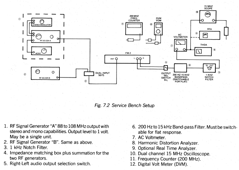 [ 모노 절차 예시 ] a. RF 발생기를 1mV, 1kHz(98.1MHz) 모노 FM 변조로 설정합니다. 튜너 후면에 있는 두 개의 레벨 조정기를 사용하여 1kHz 오디오 레벨을 0dB로 조정합니다. b. 200Hz~15kHz 대역 통과 필터가 오디오 출력에 있는지 확인합니다. c. RF 발생기 변조(CW)를 끄고 출력에서 측정합니다. 신호 대 잡음비는 75dB 이상이어야 합니다.