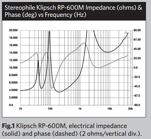 제 추정치는 89.6dB(B)/2.83V/m로 훨씬 낮았지만, 이는 소형 2웨이 스피커의 일반적인 감도보다 여전히 높습니다. 그림 1은 RP600M의 임피던스 크기(실선 트레이스)가 전체 고음역에서 10옴 이상을 유지함을 보여줍니다.