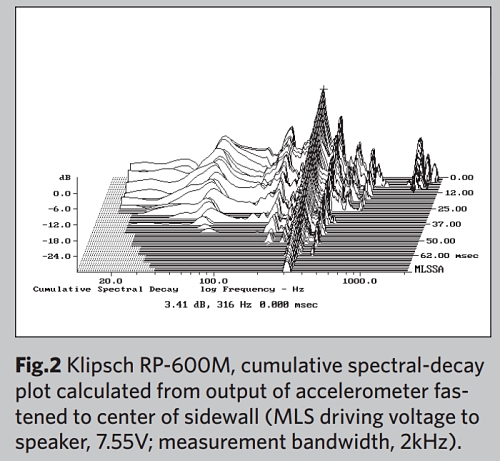 이는 적어도 이 영역에서 Klipsch가 매우 효율적이며, 스피커가 공칭 8옴 설계보다 파트너 앰프에서 훨씬 적은 전류를 소모한다는 것을 의미합니다. 임피던스는 중음역과 저음역에서 낮으며, 180~220Hz 사이에서 최소값이 3.5옴입니다. 또한 128Hz에서 5.3옴 크기와 -42° 전기 위상각(점선 트레이스)의 전류 소모가 큰 조합이 있는데, 이는 RP-600M이 4옴 출력 변압기 탭에서 구동될 때 튜브 앰프와 가장 잘 작동함을 시사합니다. 임피던스-크기 트레이스에서 300Hz 바로 위의 작은 불연속성은 해당 영역에서 일종의 공진을 시사합니다. 플라스틱 테이프 가속도계로 인클로저의 진동 동작을 조사했을 때 모든 패널에서 316Hz에서 강력한 고Q 모드와 422Hz에서 낮은 레벨의 모드를 발견했습니다(그림 2).