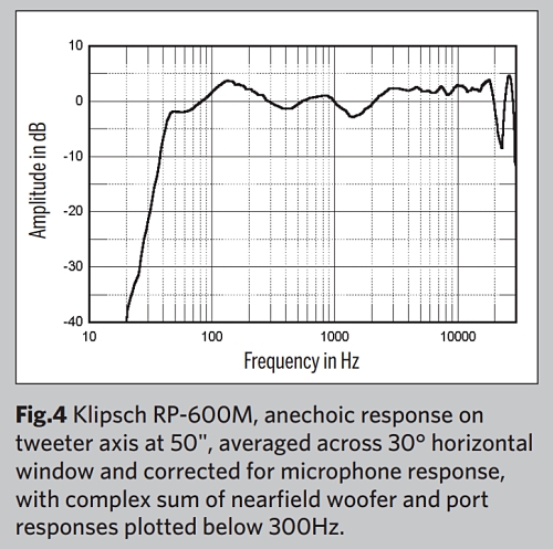저는 DRA Labs의 MLSSA 시스템과 보정된 DPA 4006 마이크를 사용하여 Klipsch Reference Premiere RP-600M의 원거리 주파수 응답을 측정했고, Earthworks QTC-40 마이크를 사용하여 근거리 응답을 측정했습니다. 측정 시 그릴은 제거했습니다. Klipsch의 지정 감도는 96dB/2.83V/m로 매우 높습니다.