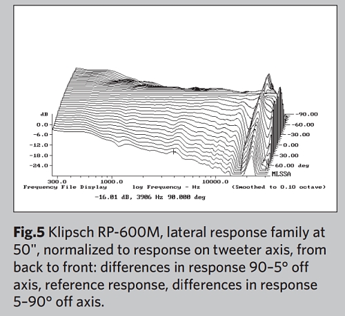 클립쉬의 수평 분산(그림 5)은 주파수가 증가함에 따라 고음에서 스피커 측면으로 고르고 잘 제어된 롤오프가 특징입니다.