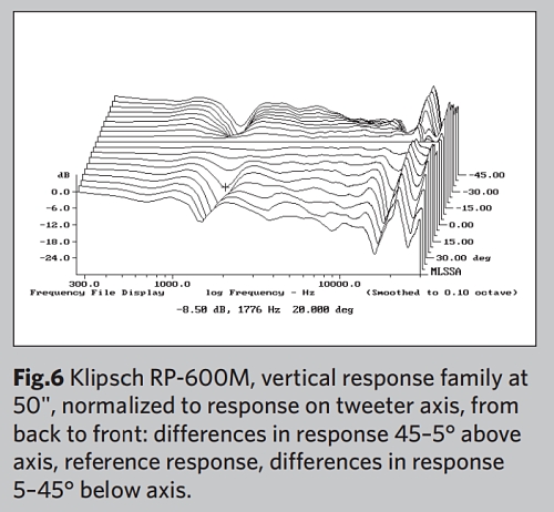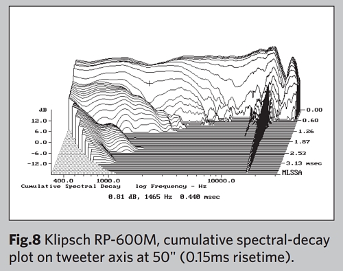 트위터의 스텝은 우퍼의 스텝이 시작되기 전에 감쇠하기 시작했는데, 이는 두 유닛 간의 최적의 블렌딩이 트위터 축 바로 아래에서 발생함을 시사합니다. 클립쉬의 누적 스펙트럼 감쇠 플롯(그림 8)은 매우 깨끗합니다. 전반적으로, 그리고 생동감 넘치는 인클로저를 제외하면, 클립쉬 레퍼런스 프리미어 RP-600M은 특히 저렴한 가격을 고려할 때 인상적인 측정 성능을 제공합니다. 존 앳킨슨
