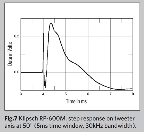시간 영역에서 RP-600M의 스텝 응답(그림 7)은 두 드라이브 유닛이 모두 양의 음향 극성으로 연결되어 있음을 나타냅니다.