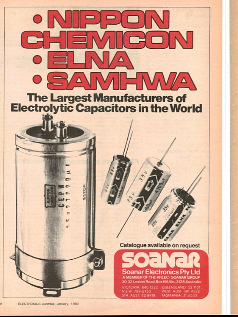 머나먼 호주 땅의 어떤 부품상이, 일제 커패시터와 함께 삼화콘덴서 제품을 전시하고 있다. 언제? 1982년 7월에.