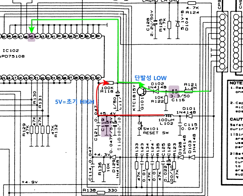 그러니까… 다이오드 + 커패시터 + 트랜지스터 조합 LOW 펄스 생성 회로가 문제인 것.