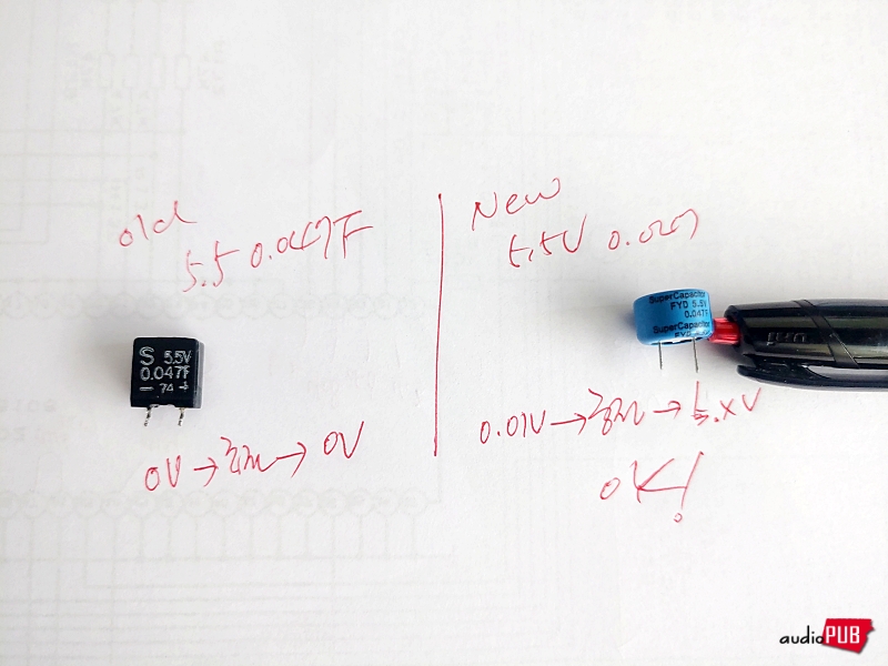 사용 목적은, 사용자가 AX-7R의 AC 플러그를 빼고 기기를 한참 동안 보관했다가 다시 AC 플러그를 꽂고 사용하려고 할 때의 POR 처리 즉, 최초 HIGH 상태를 유지하거나 또는 무엇인지 모를 마지막 동작 상태를 기억하거나. 튜너의 경우라면, 메모리 백업용으로. (당장에 교체품이 없으면 1000uF짜리 커패시터를 써도 된다.)
