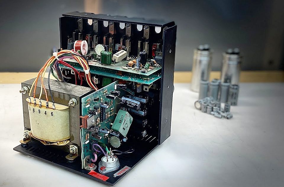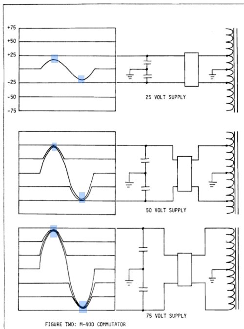 “… M-400의 트라이악 점호각은 유휴 상태에서 최대값으로 미리 설정된 다음 증폭기의 부하 요구에 따라 지속적으로 변경됩니다. 점호각을 결정하는 위상 제어 RC 네트워크에는 점호각을 90도(일반적으로 95도)보다 약간 크게 제한하는 고정 요소가 포함되어 있습니다. 이 최대 한계는 변압기 코어의 포화 레벨과 2차 필터 커패시터의 정격 전압에 해당합니다. 2차 회로의 DC 전압은 레귤레이터 트랜지스터(Q6)와 +50, +75 및 -75 DC 레일에서 가져온 감지 라인으로 구성된 피드백 레귤레이션 시스템에 의해 모니터링됩니다. 그림 1을 참조하십시오.