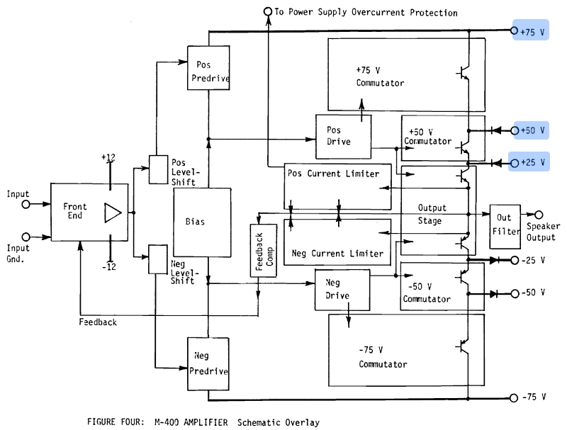 75VDC 전원 공급 장치는 독립적으로 필터링되며 고전류 브리지 정류기를 포함합니다. 최상위 단계의 출력 트랜지스터에 전원을 공급하여 최대 정격 출력을 제공합니다. 세 가지 주요 전원 레벨은 모두 조정되지 않으므로 전류 수요에 따라 변동합니다. 이러한 변동은 피드백 레귤레이터의 작용으로 감소되므로 증폭기의 수요 증가에 따라 주요 전원 레벨이 유지됩니다…” (기타 생략) (Technical Service Manual 출처 : https://www.manualslib.com/download/1015790/Carver-M-400.html)