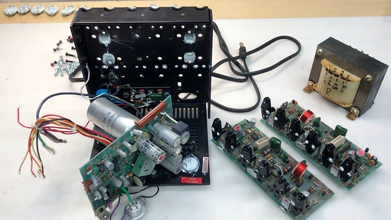 가장 안쪽 단에 있는 25 VDC 전원은 해당 변압기 2차 권선, 병렬 브리지 정류기 2개, 그리고 2200μF 필터 4개로 구성됩니다. 이 전원 공급 장치는 채널당 두 개의 출력 트랜지스터를 구동하여 전파 오디오를 수신하고 스피커 부하를 직접 구동합니다. 중간 단계인 50VDC 전원 공급 장치는 별도의 브리지와 25V 전원 공급 장치의 브리지 위에 “스택”된 2200μF 필터 한 쌍으로 구성됩니다. 채널당 두 개의 출력 트랜지스터를 구동하며, 신호에 따라 내부 트랜지스터 쌍의 클리핑을 방지하기 위해 켜집니다.