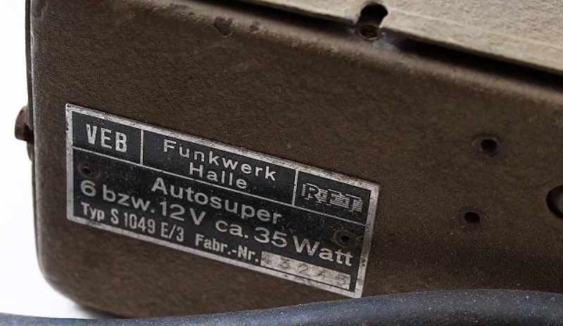 (▲ DC 12V 자동차 전원으로 만사형통이었다는… VBE는 Volkseigener Betrieb(국영기업 집단)의 약어. 말하자면, 통합 브랜드이다. Funkwerk Halle 공장에서 만들었다는 뜻인 것 같고…)