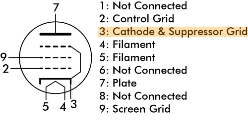 1) 아래는 5 극관. 가장 전형적인 3극 진공관에 대비, #9 스크린 그리드와 #3 밑바닥 캐소드에서 연장된 2차 그리드가 더해진 상태이다.