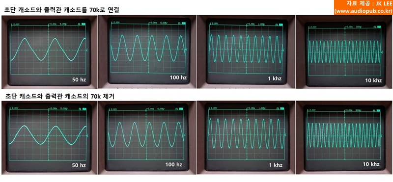 저역의 대역을 늘리기 위해 부스트 회로(고역레벨 감쇄)를 추가하려고 입력단을 점검합니다. 입력단 볼륨에 사인파를 넣고 초단 그리드 부분을 스코프로 찍어보니…. 기가 막히는 현상이 발견됩니다.