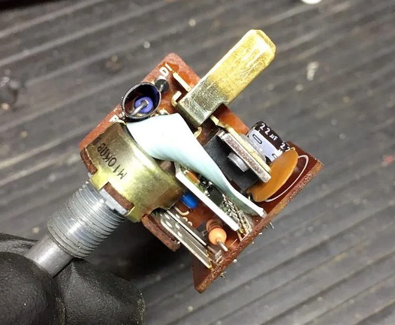 예시로서, 다음은 어떤 반도체식 리오스태트 모듈. 빈티지 오디오 관리의 관점에서, 매우 익숙한 오류 변수가 눈에 들어온다. 심심하면 나가 자빠지는 가변저항과 동작 수명이 정해져 있는 커패시터와 가끔 뒤로 넘어가는 반도체 소자와 모든 것의 수명 주기를 단축시키는 함체 내 발열 등.