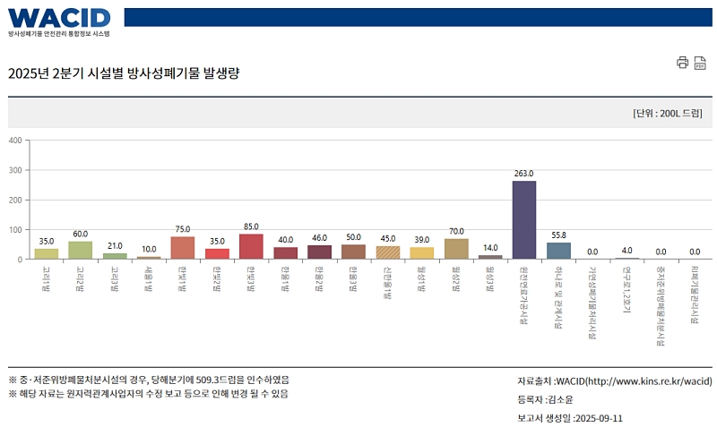(▲ 이상의 고준위 폐기물에 더하여, 병원이나 산업계에서 나오는 저준위 폐기물까지 더하기. 그러면, 총량은 더 많아진다. 출처 : https://www.kins.re.kr/wacid/mdlev02?catId=03)